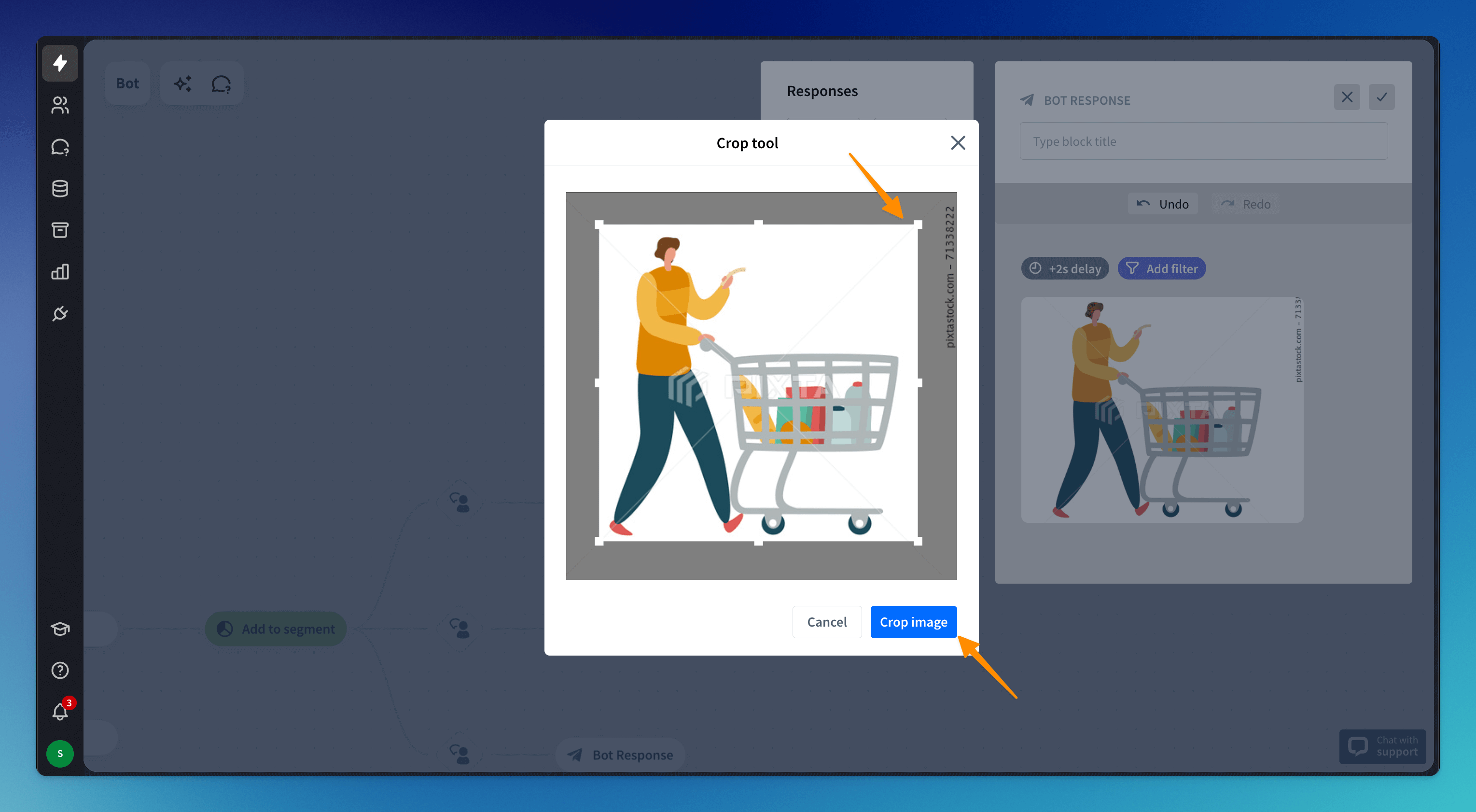 Go to your bot and open the Bot response block. Select the Image response and drag and drop your image. You can also browse your computer files to choose from there.