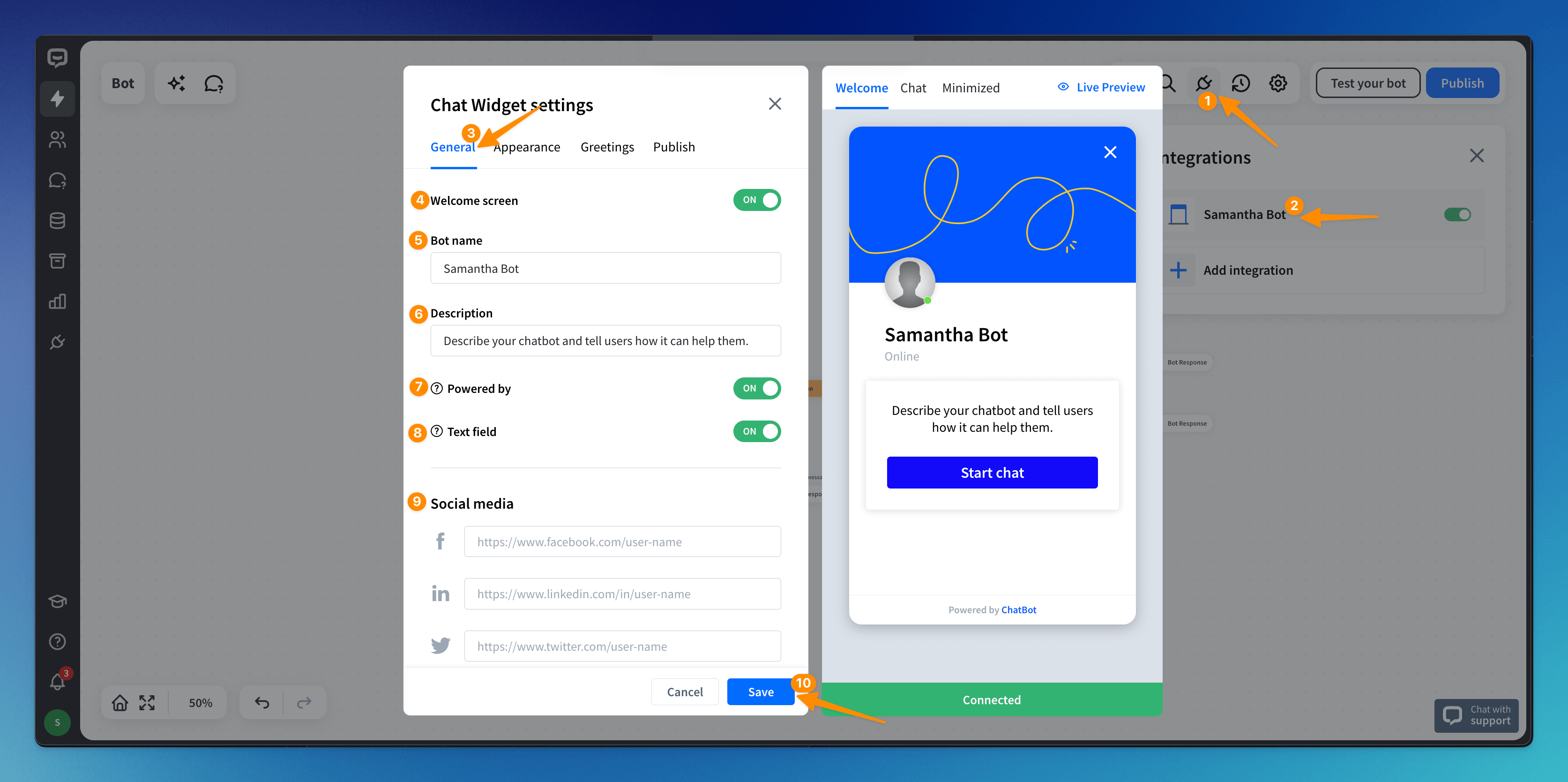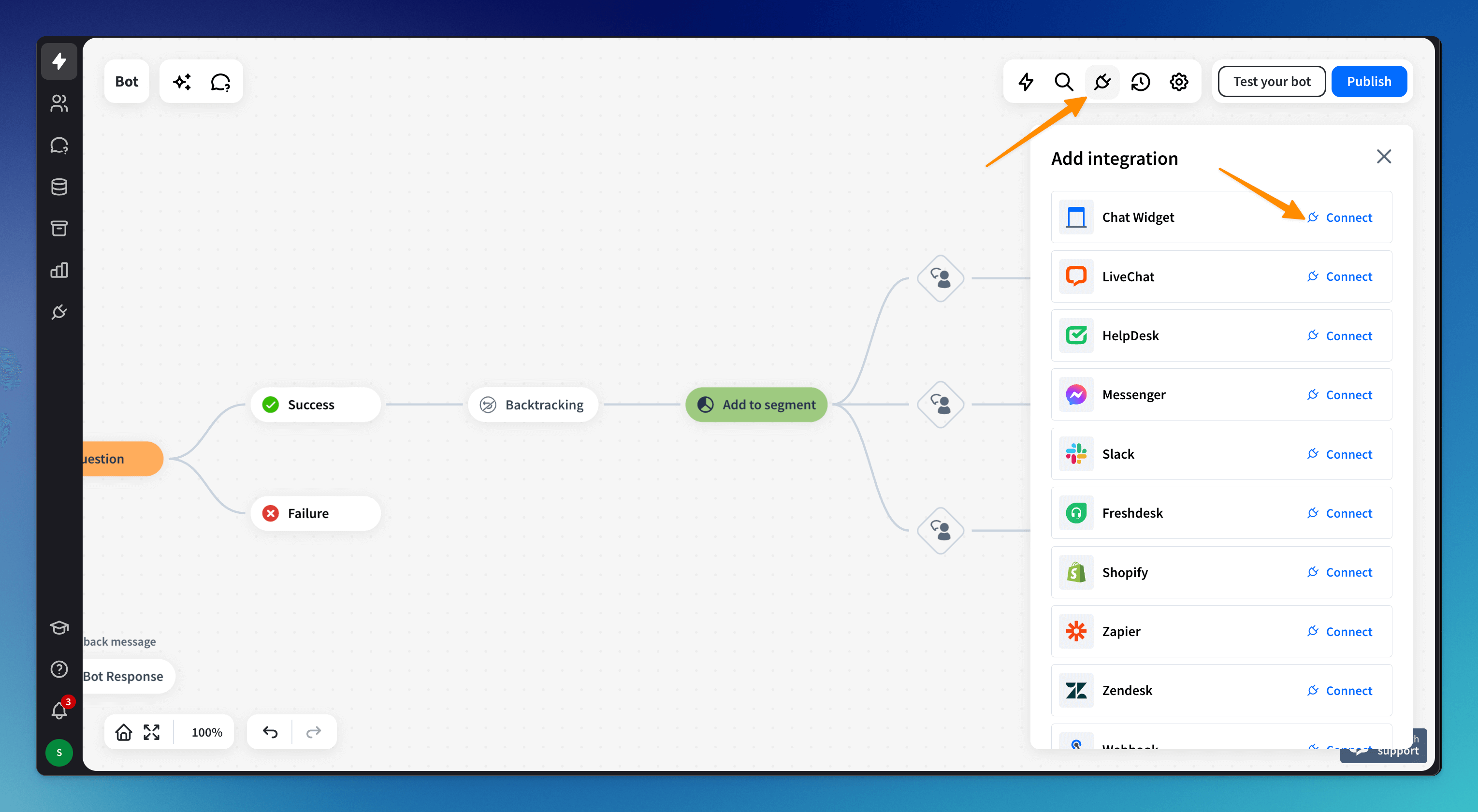 1. Open your bot and go to the Integrations icon. Click Connect next to the Chat Widget legacy option.