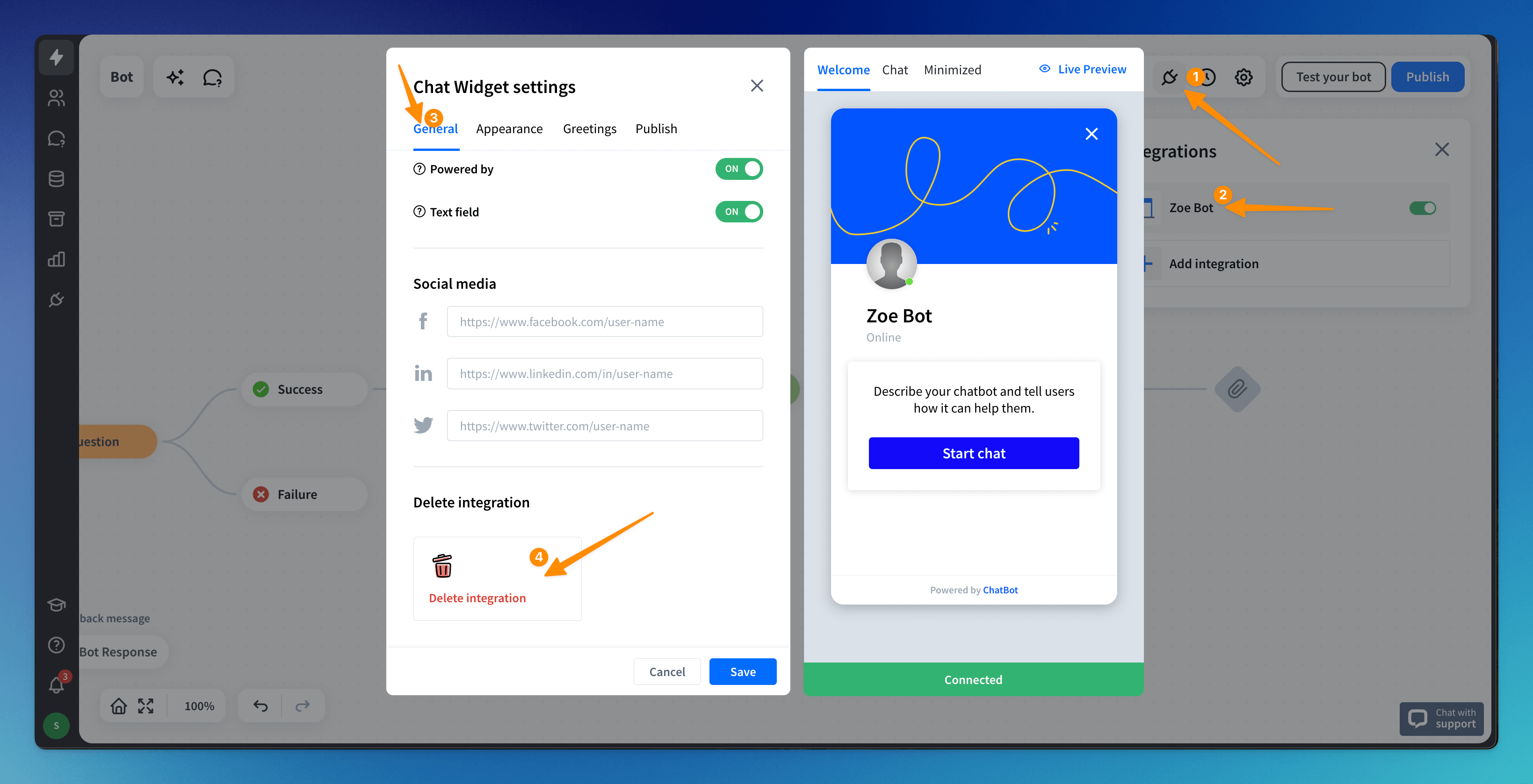 To delete the integration from your site, delete the tracking code from the source code or go to the Chat Widget legacy integration and delete the integration using the button in the General section.