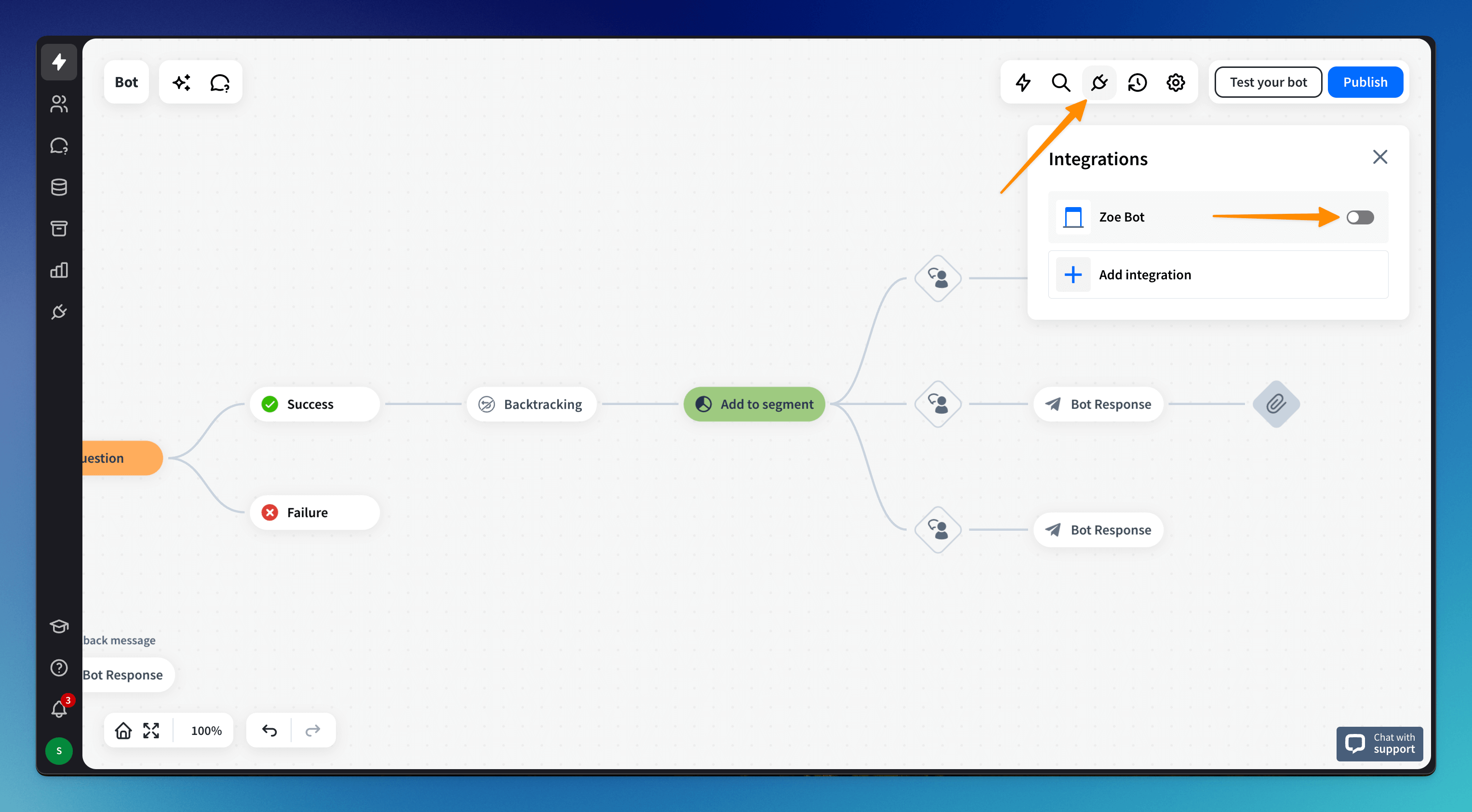To disable the bot without erasing it completely from your site, go to the Chat Widget legacy integration and switch the integration toggle to the off position.