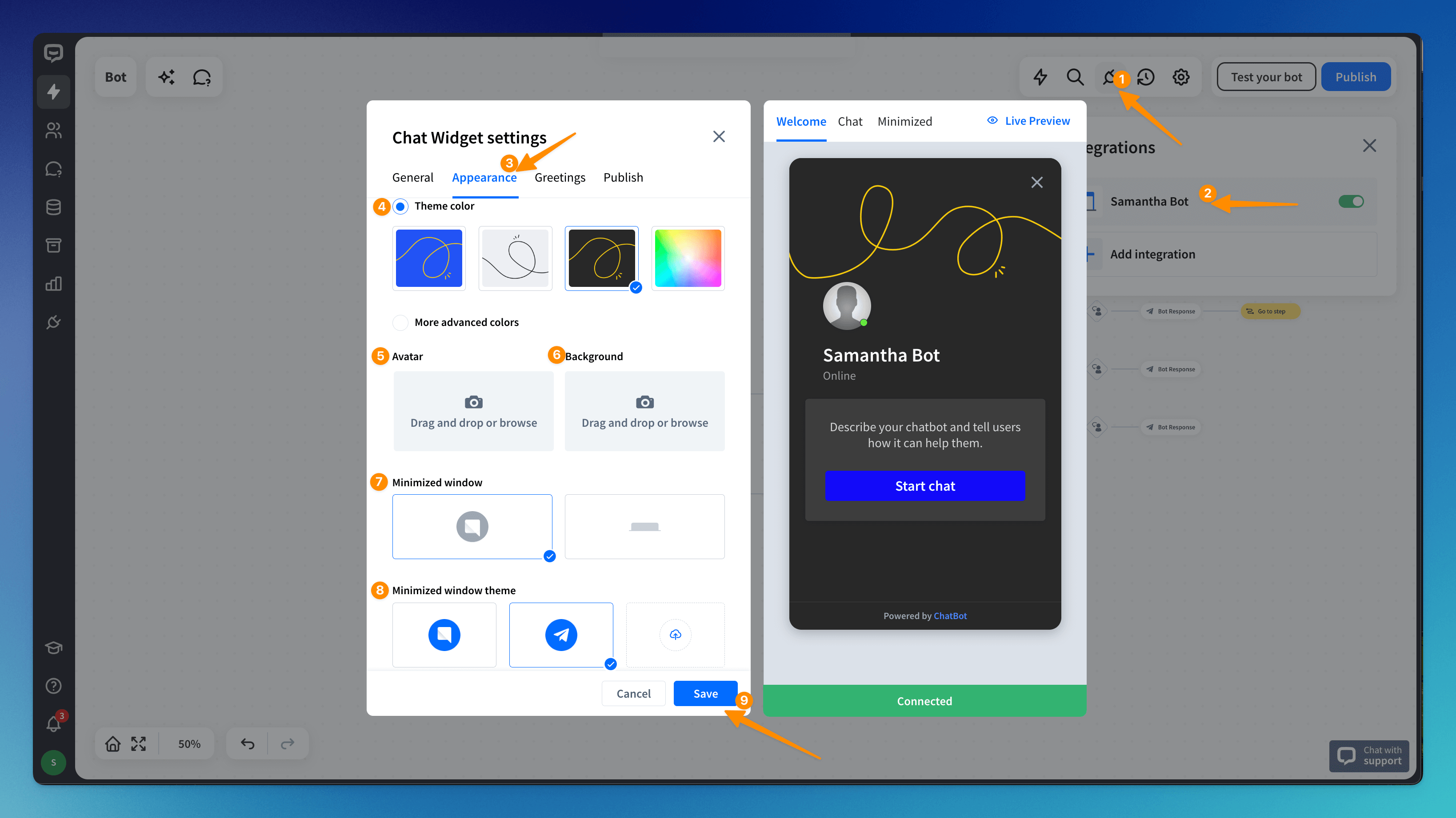 When the bot is integrated with LiveChat, all changes should occur in the LiveChat Chat Widget configurator, which should be installed on your site. See how to customize the LiveChat Chat Widget.