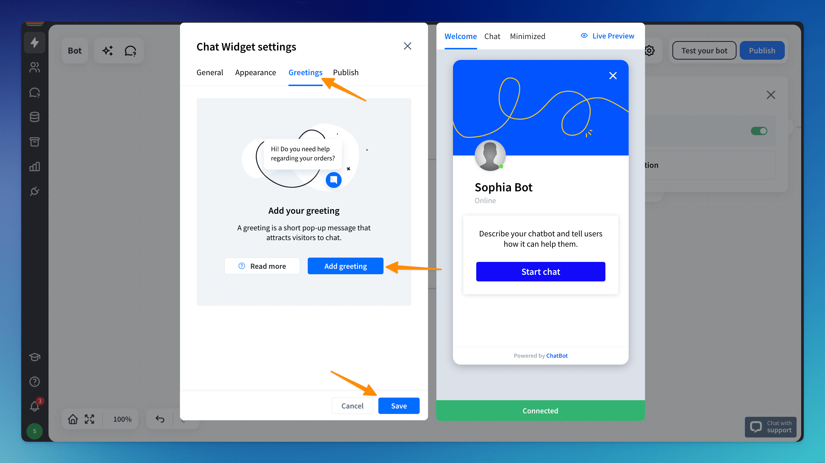Go to the Greetings section and choose the Add greeting button. Add the greeting’s title and message. The title will not be visible to users. Then, set conditions for the message to be displayed.