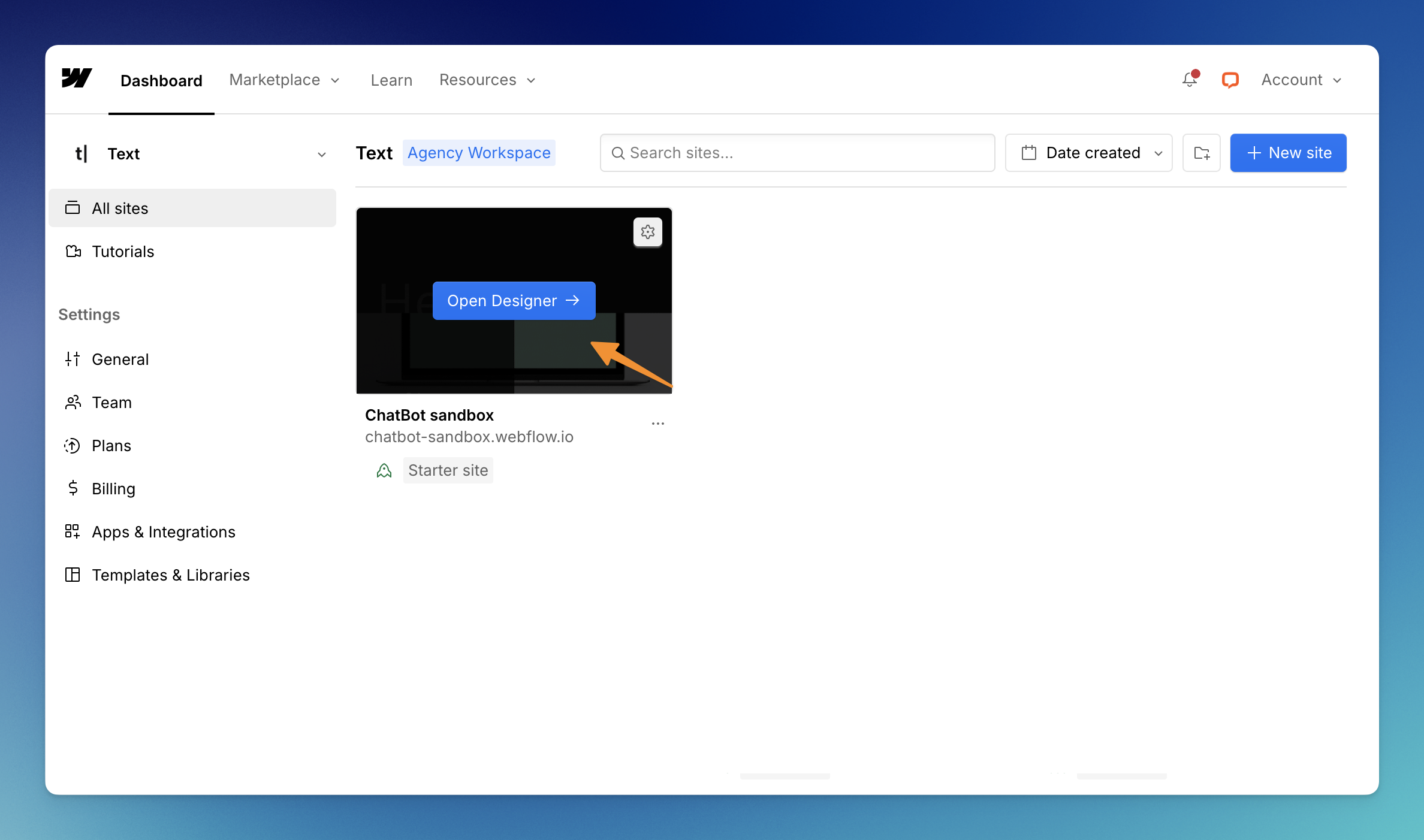 Log in to your Webflow account and select View dashboard. Select the page on which you want to add a bot.