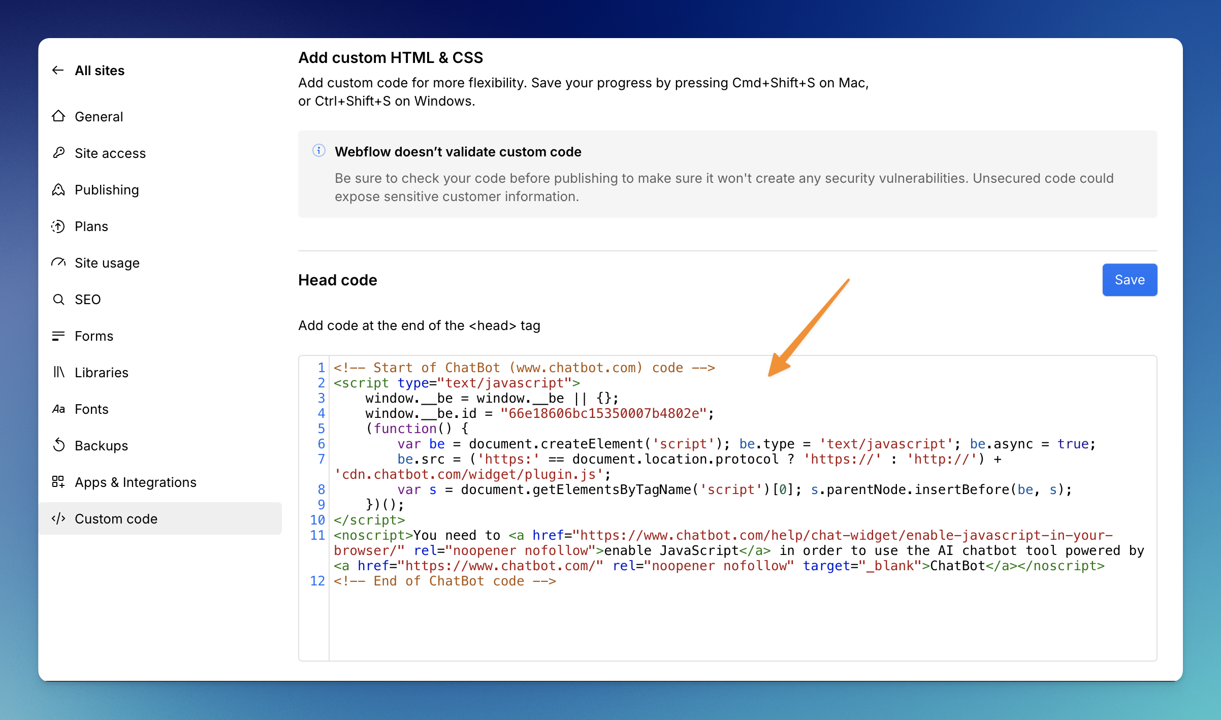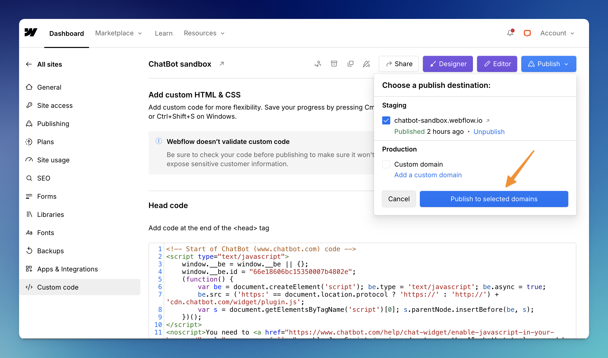 Paste ChatBot’s chat widget code in the Head Code section. Click on Save Changes. Once your changes are saved, select Publish.