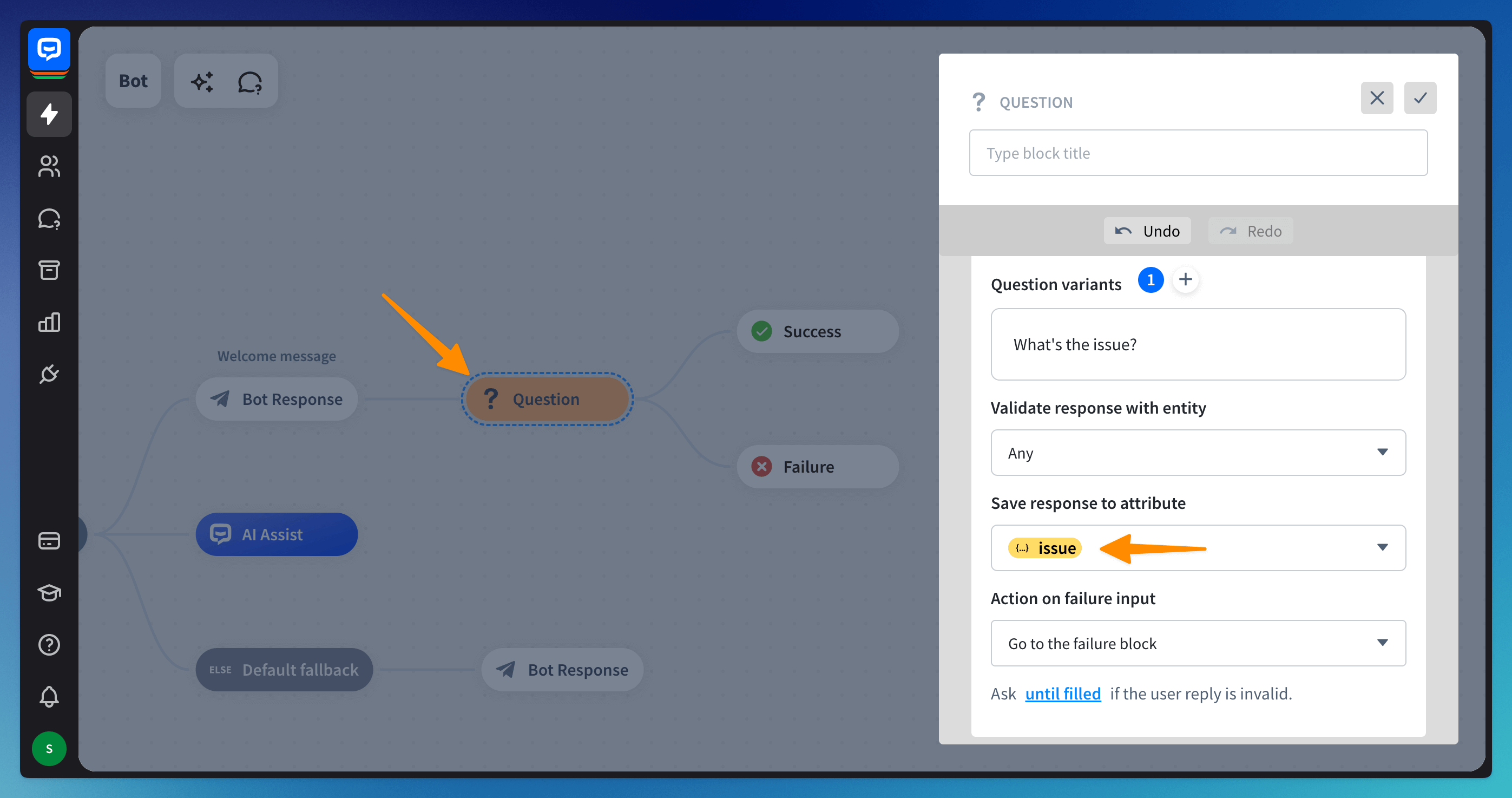 To facilitate the integration process, name the Question action and the Bot response block. In the configuration, you’d need to choose the block from the list.