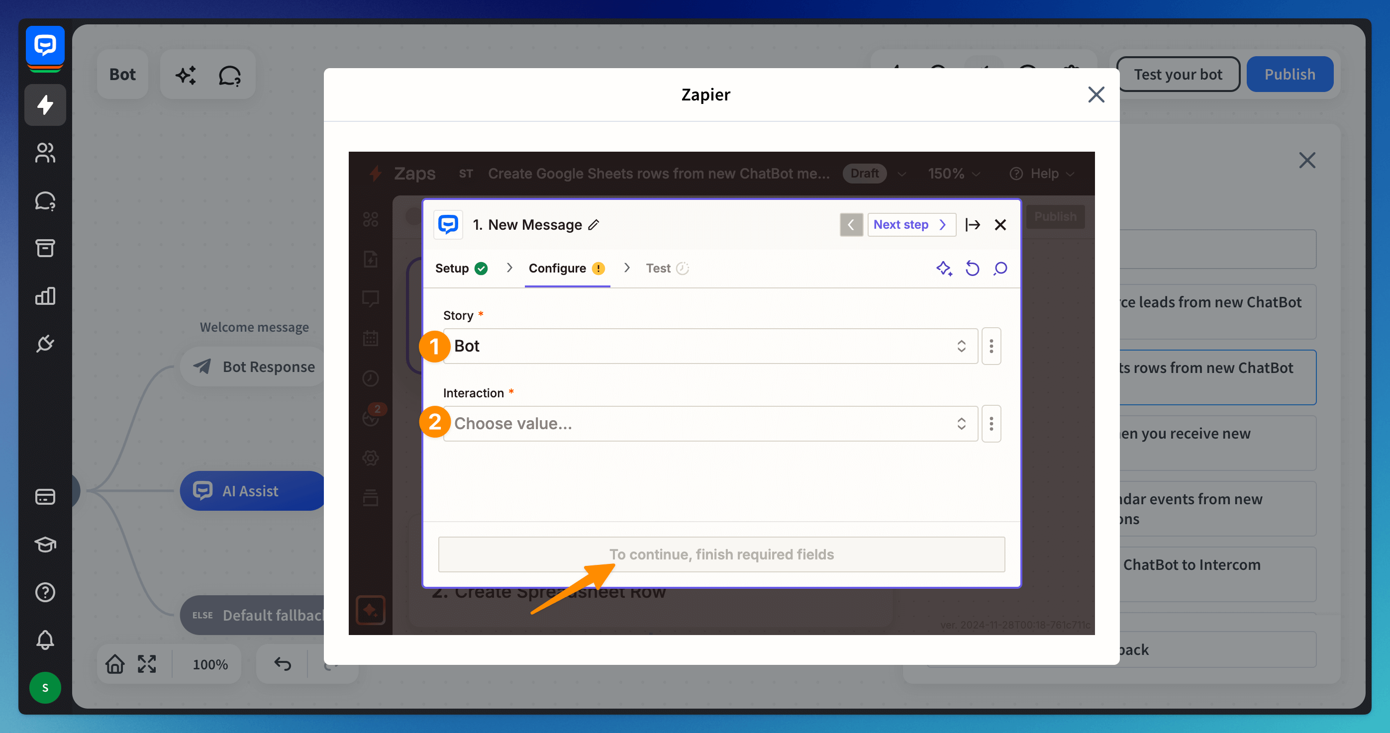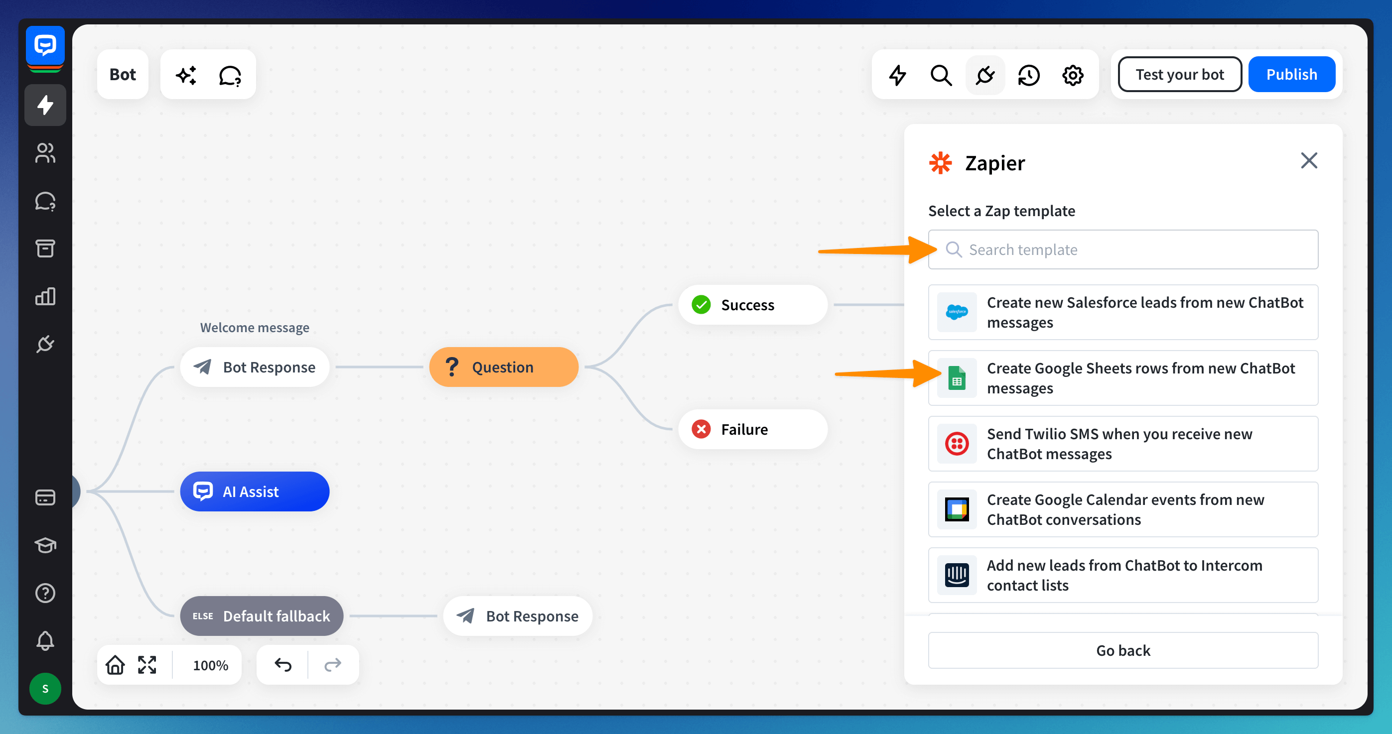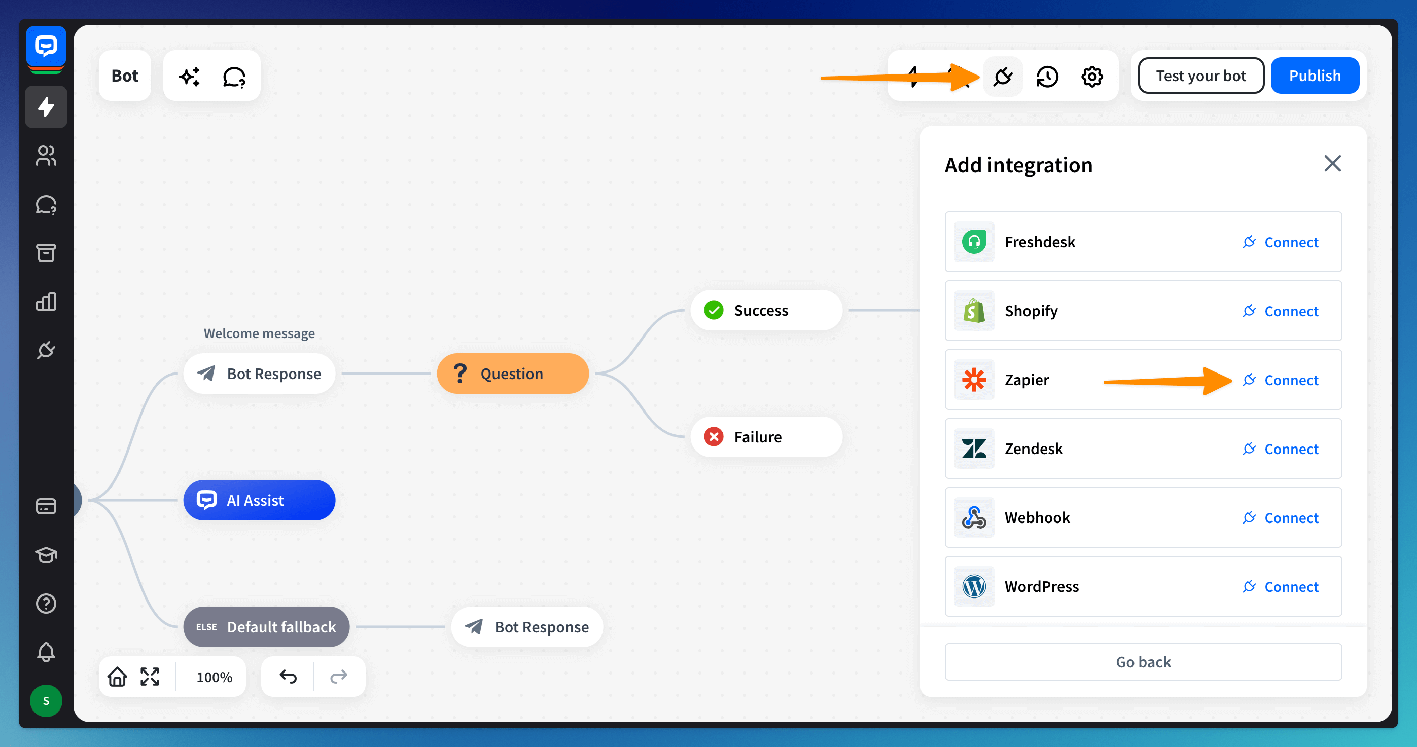 1. Go to the bot. Open the Integrations panel and choose Zapier from the list.