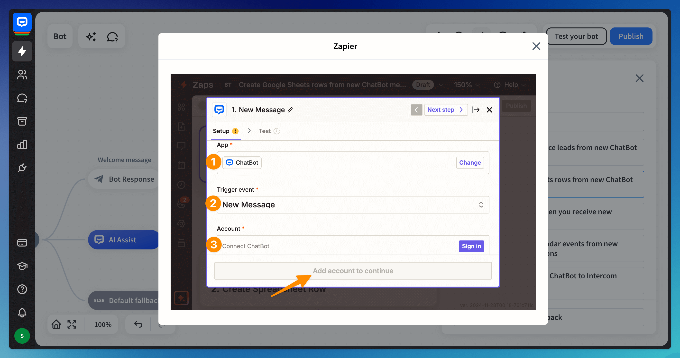 1. Click on the ChatBot module. Choose ChatBot in the App field (1), the New message in the Trigger event field (2). Then, sign in to the ChatBot account (3). Continue.