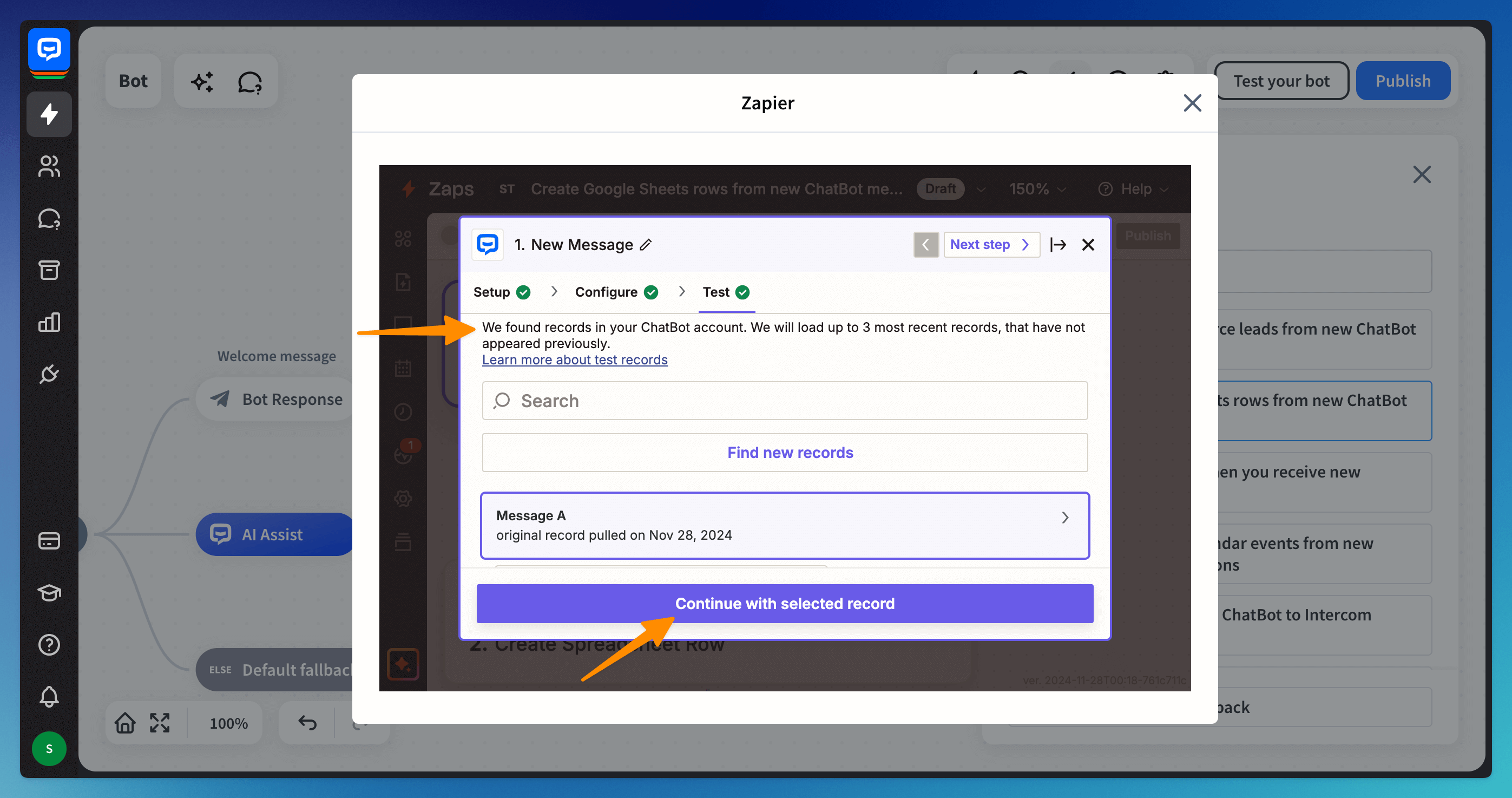 In this step, the values of these messages are test values. After you turn the Zap on and test it live, the integration will send attributes with actual values provided by the user during the chat.