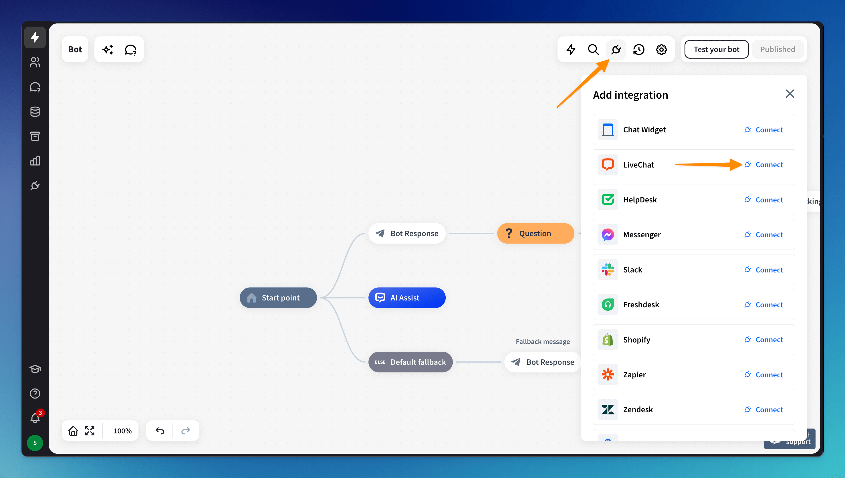 Go to the bot view and open the Integrations menu. From the Integrations list, choose the LiveChat integration. Then, click the Connect button.