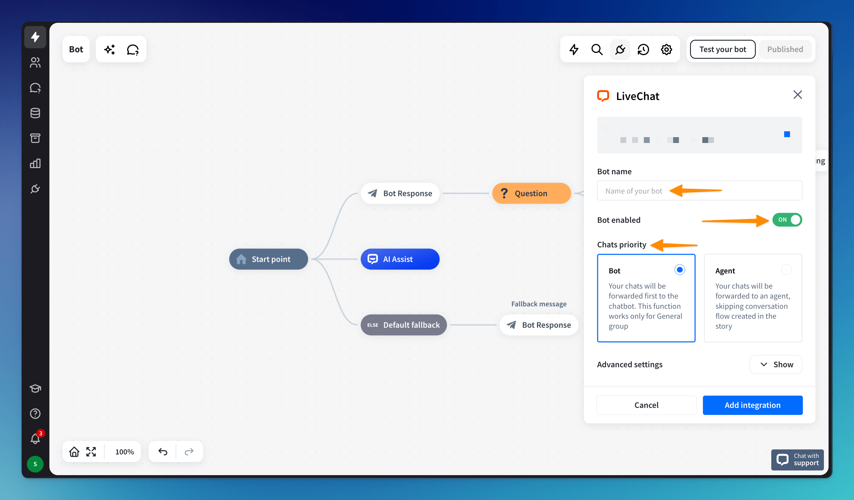 choose the Chats priority: Bot - the bot will be the first to respond as first-line support; Agent - a real agent will be the first to respond, and the bot will be a secondary support system