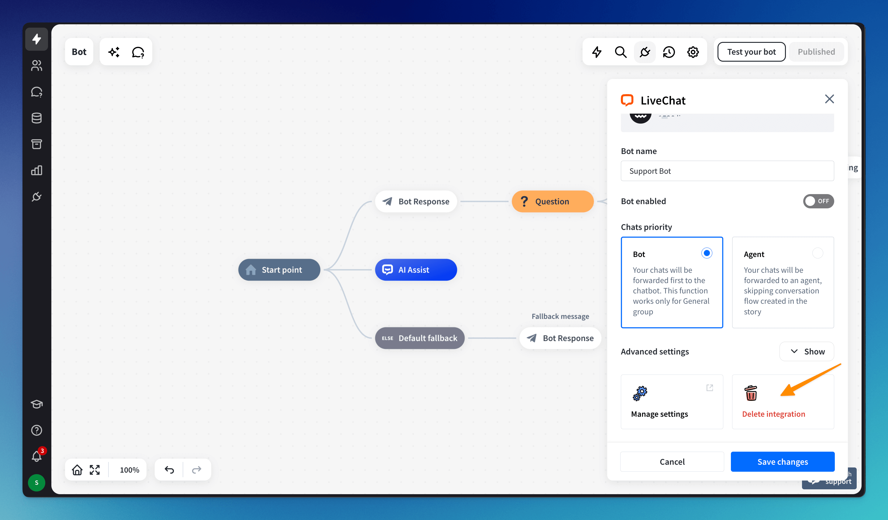 To erase the bot from the LiveChat Chat Widget, select the LiveChat integration from the list. Then, click on the Delete integration field and confirm the choice.