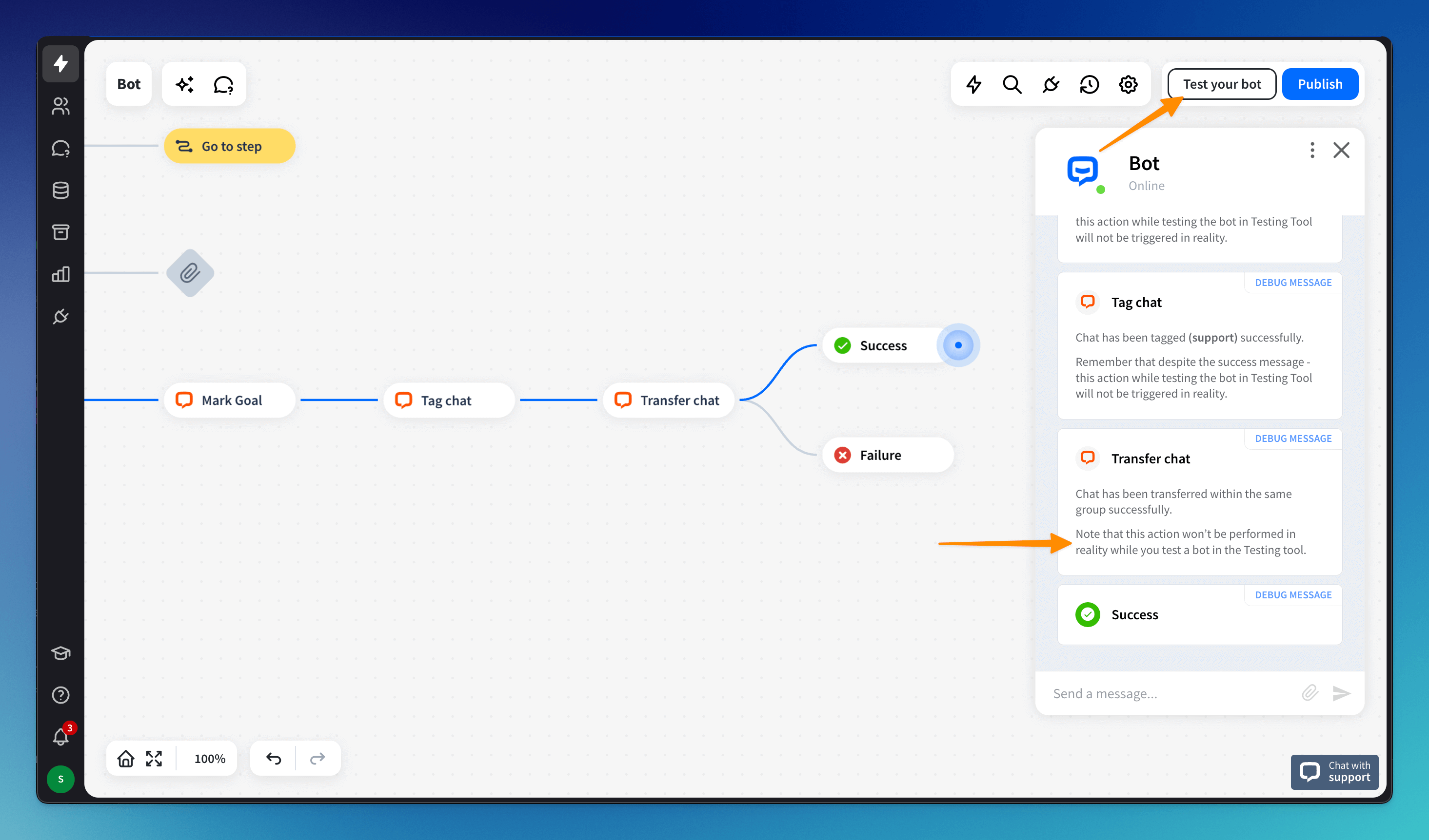 So, for instance, if you add the Transfer chat action to your bot, the information will be displayed, but the chat won’t be transferred in the Testing tool. It won’t be visible in the LiveChat app, either. This can also be seen in the Archives section in ChatBot.