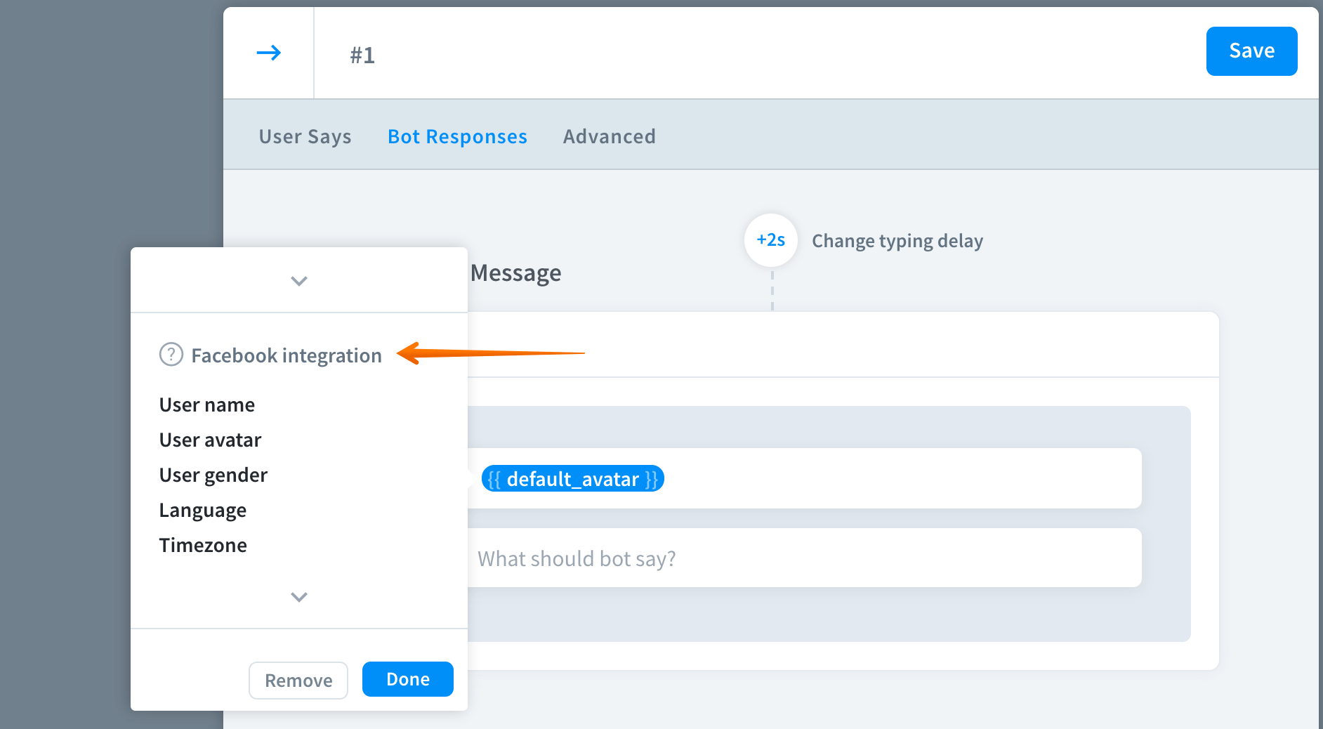 ChatBot automatically collects data about your users from integrated apps. Let’s use one of them to create a nice personalized Welcome Interaction. The following example uses the Facebook Messenger integration.