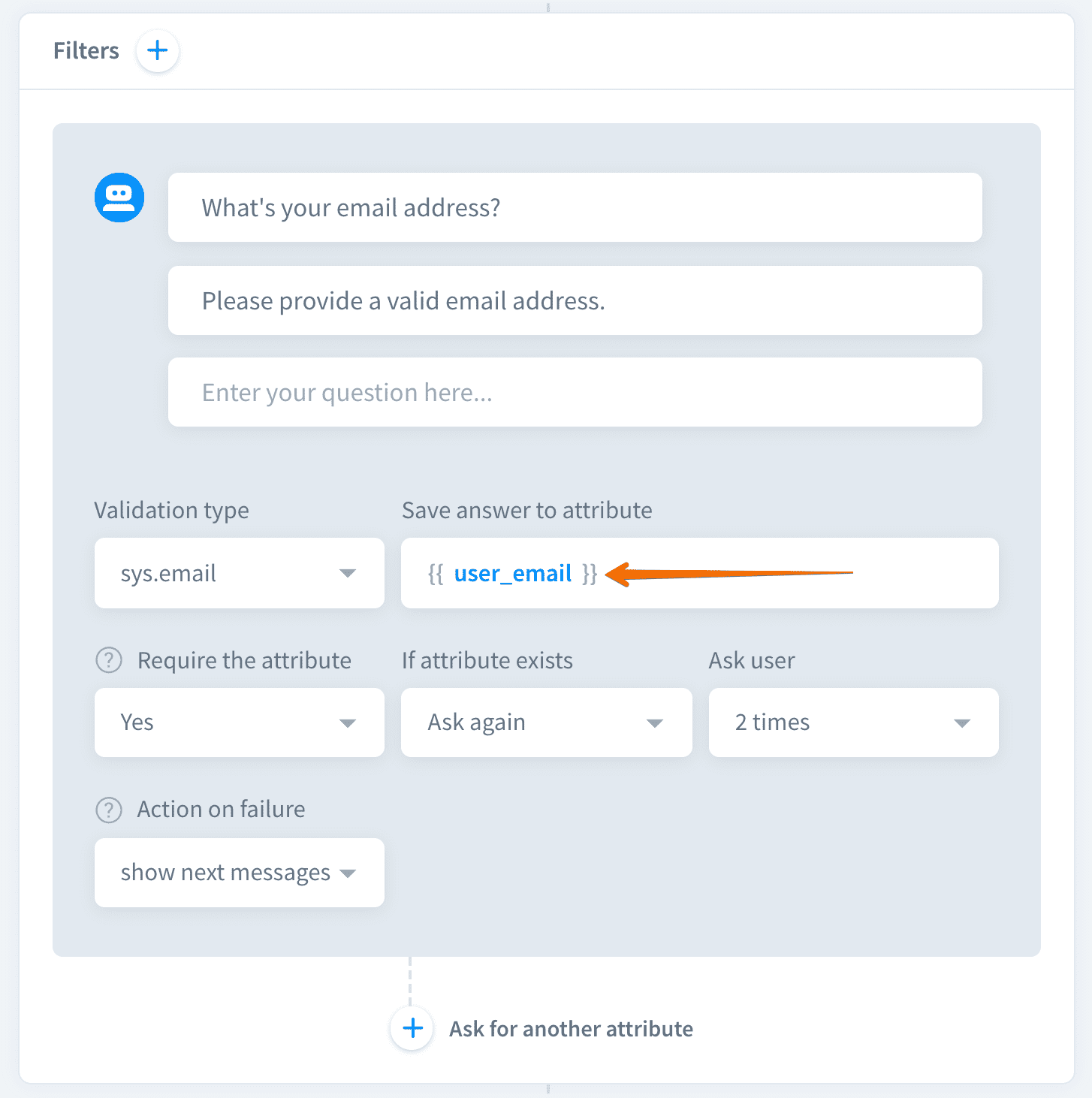 User attributes allow you to store any value you want. To get the data you can use system or user entities. In the following example, we’ll be saving email address using the emai system entity.