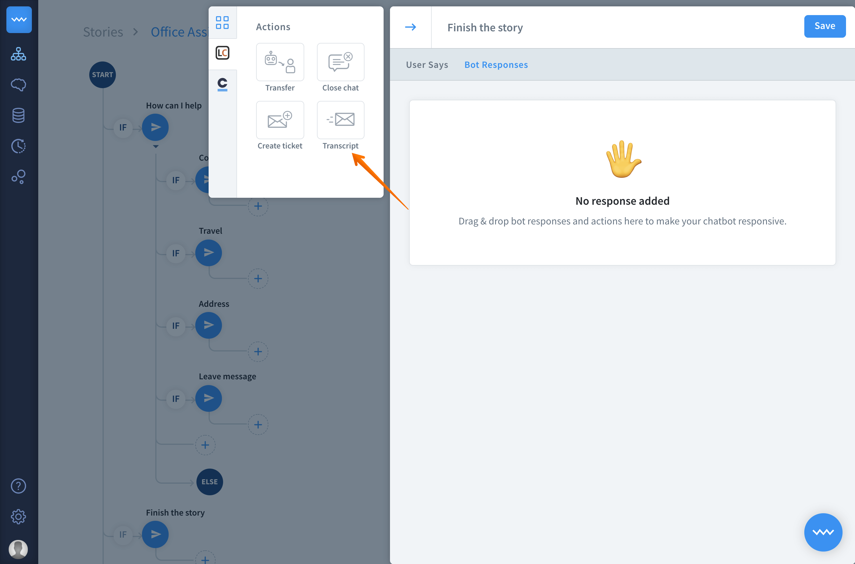 Analyze the scenario and decide which part of the story would be considered as the final one. Go to bot responses and find the transcript action in the LiveChat section.