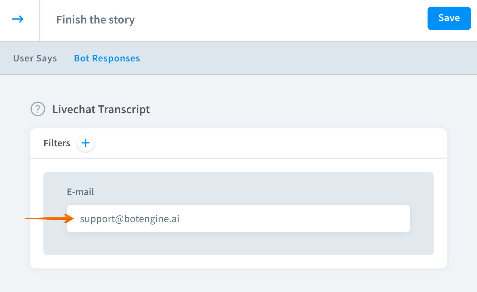 The transcript action allows you to set the point of the story that will automatically send you an email with the full transcript of the conversation. You can use this action together with filters and other actions and responses. The user won’t be informed that the chat transcript has been sent. Keep in mind that this action works only with the LiveChat integration and you’ll need to use the LiveChat window to test its performance