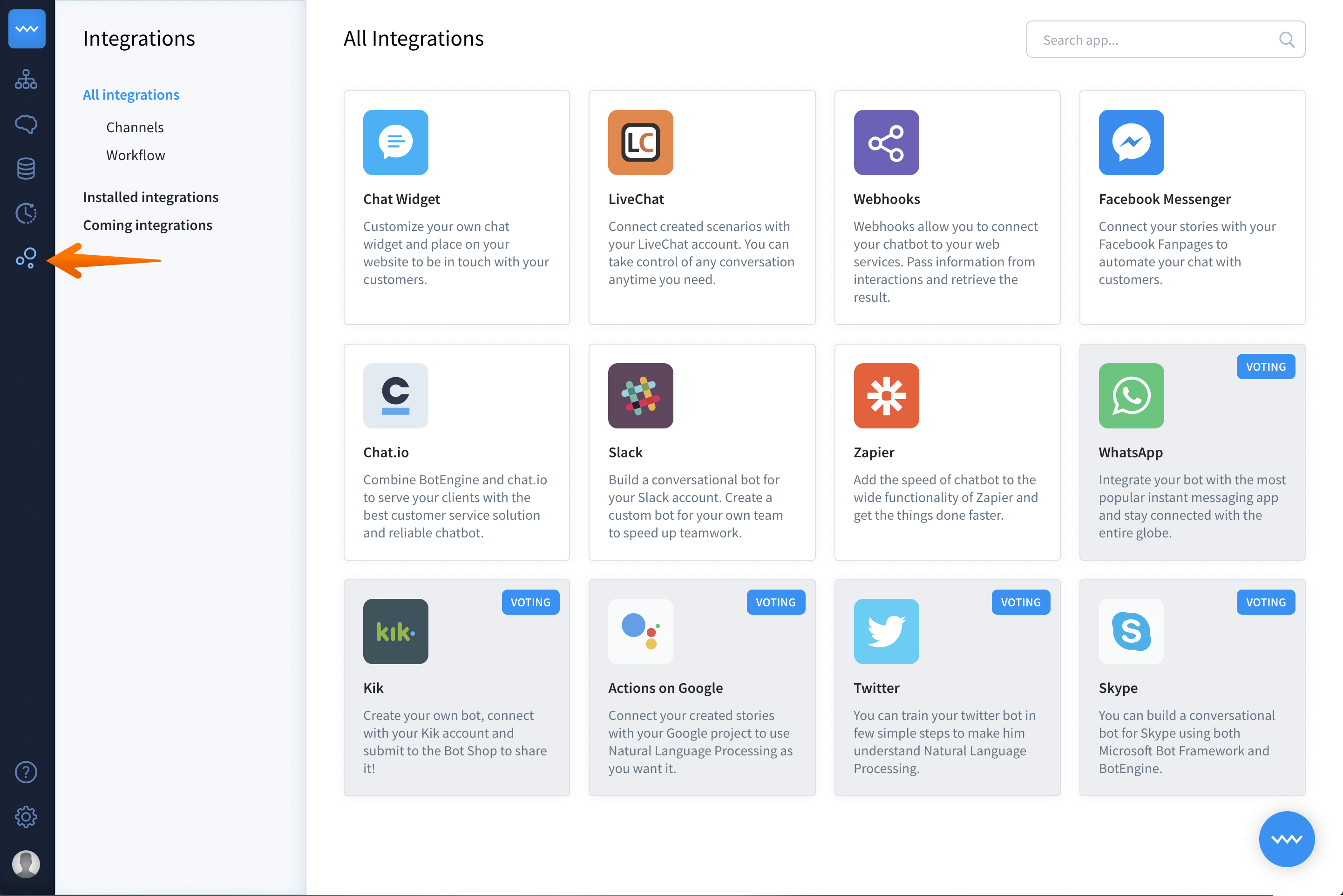 Go to ChatBot app and select integrations from the left panel of your dashboard.