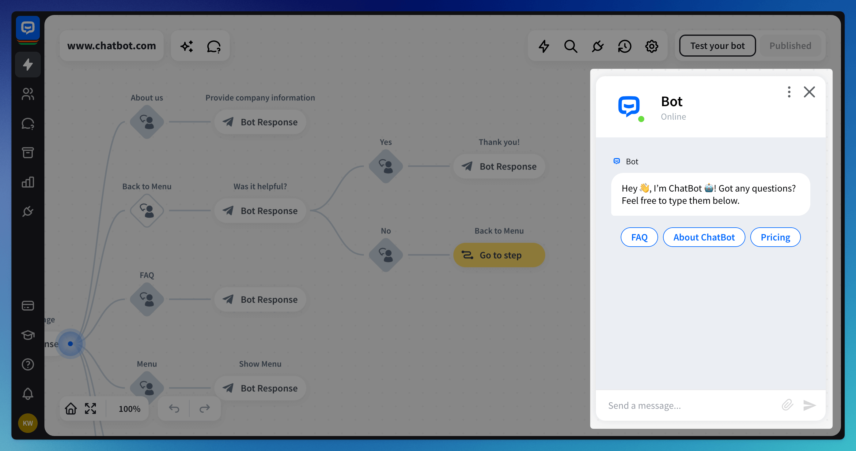 The testing tool allows you to test your bot within the bot builder. You can see which interactions were triggered by test messages. You can adjust the bot flow on the go and check whether everything works as intended before your chatbot connects with users.