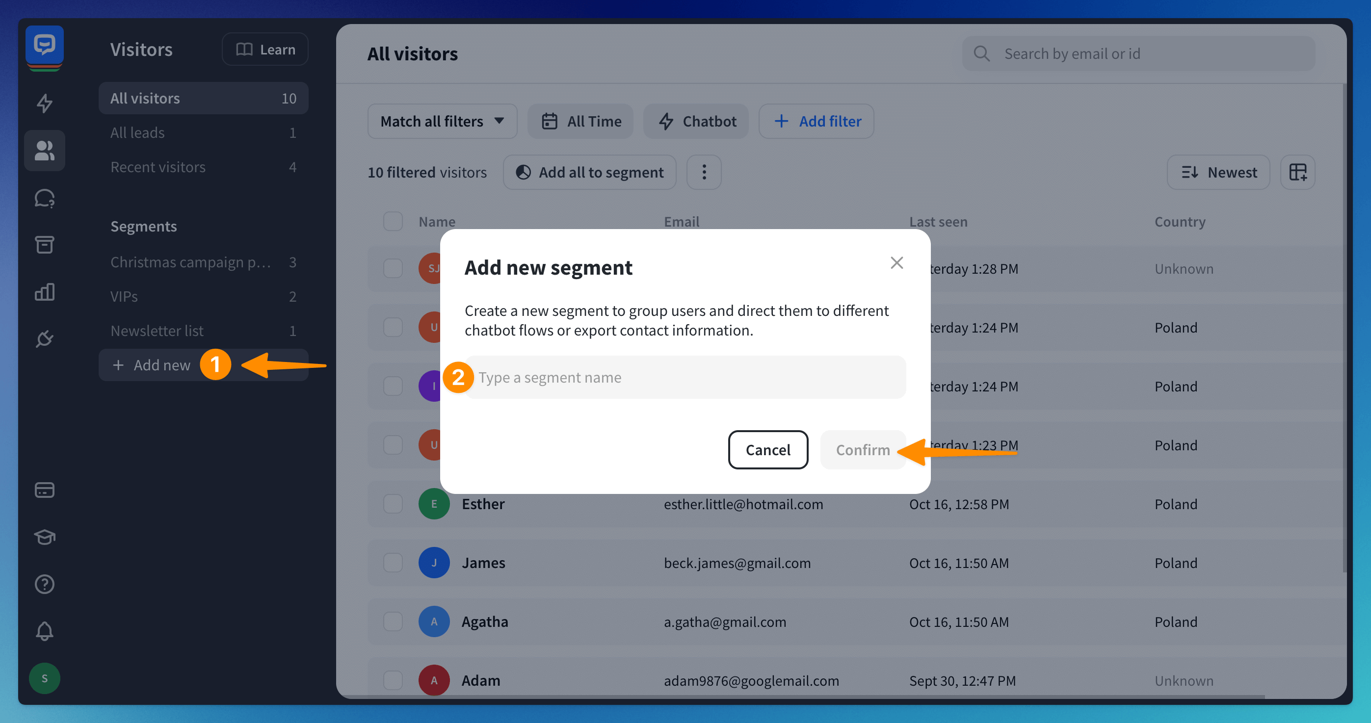 ChatBot automatically collects all visitors who chat with it and stores their data in the Visitors section. Depending on your needs, you can add or delete visitors from Segments at any point in that section. You can also design the bot flow to send different messages for visitors added to segments.