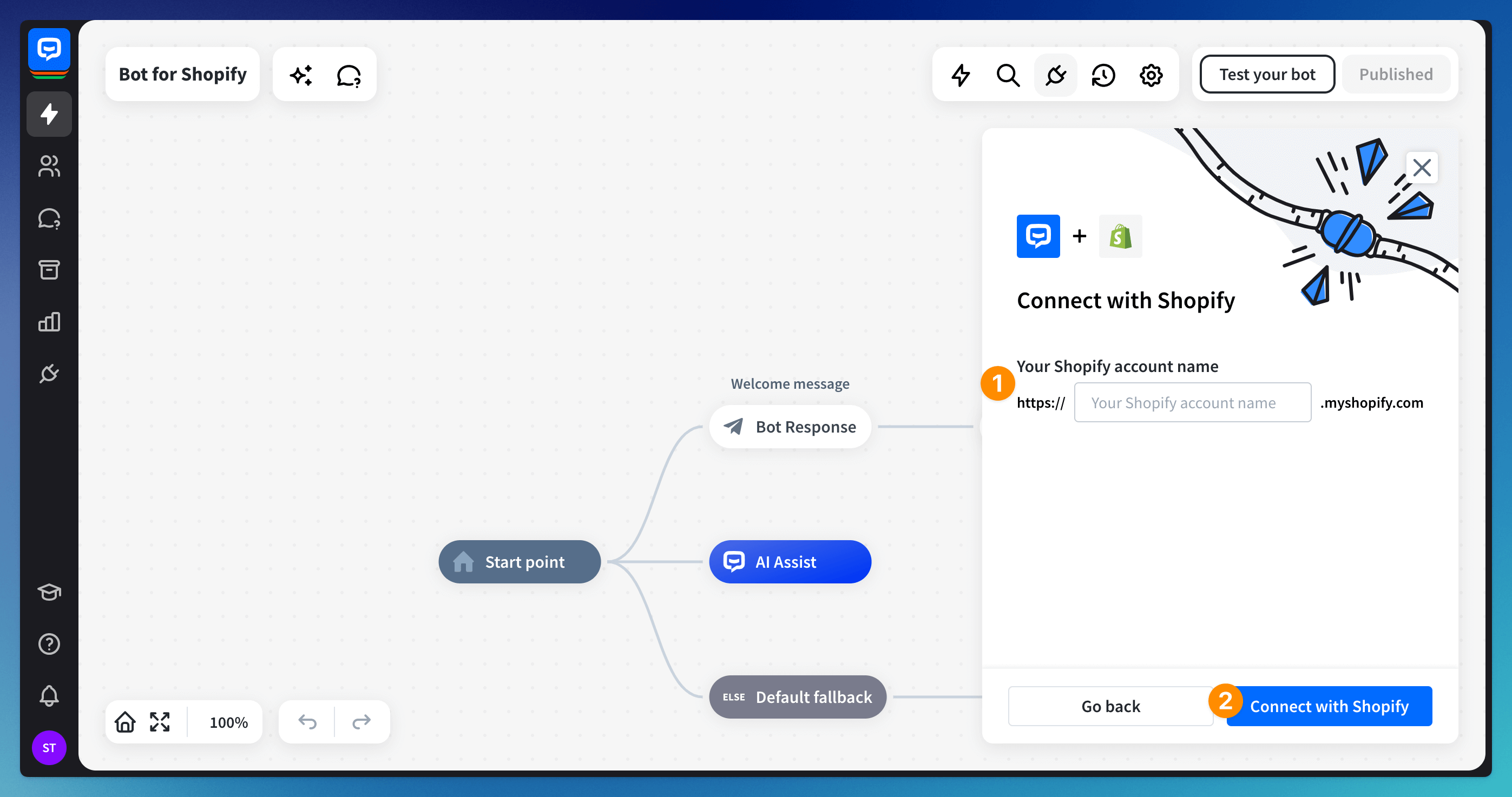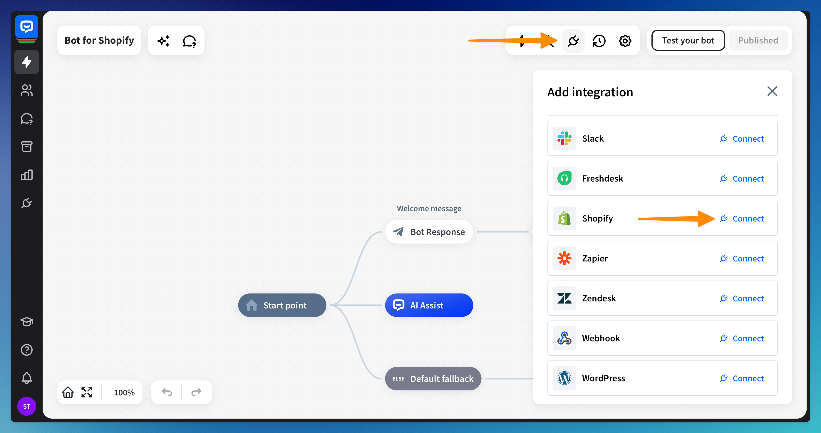 Go to your bot and choose Shopify from the list in the Integrations panel. Select Connect with Shopify.