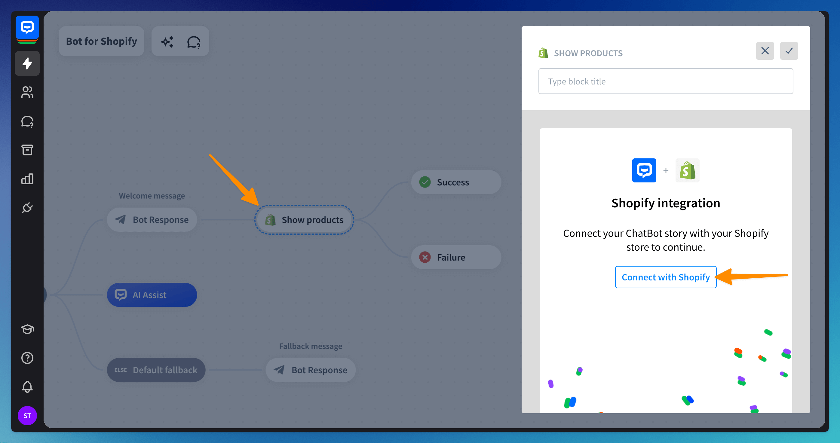 Select the Shopify action and add it to your bot flow. Open the block and select Connect with Shopify button. Finish the installation process.