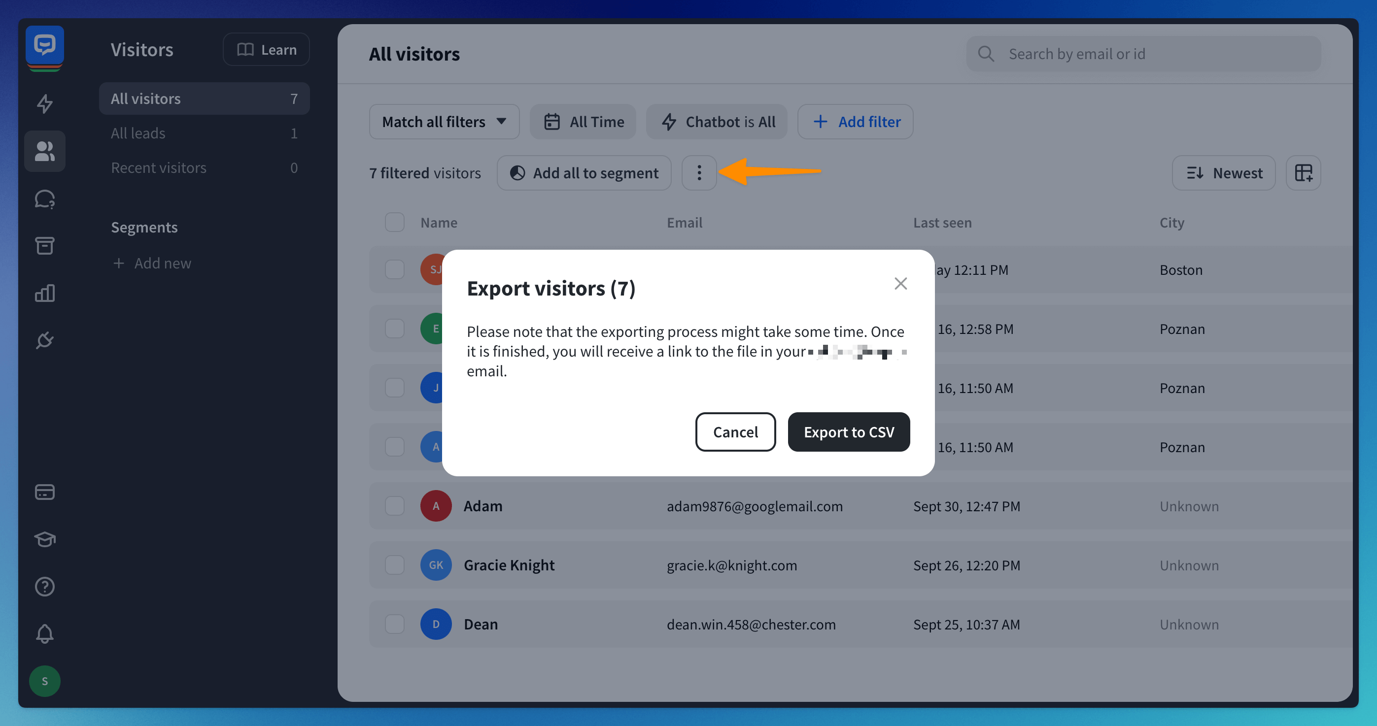 You can perform the same actions as in the All visitors section — add visitors to segments, filter them as needed, export the information, and delete visitors under the 3-dot symbol.