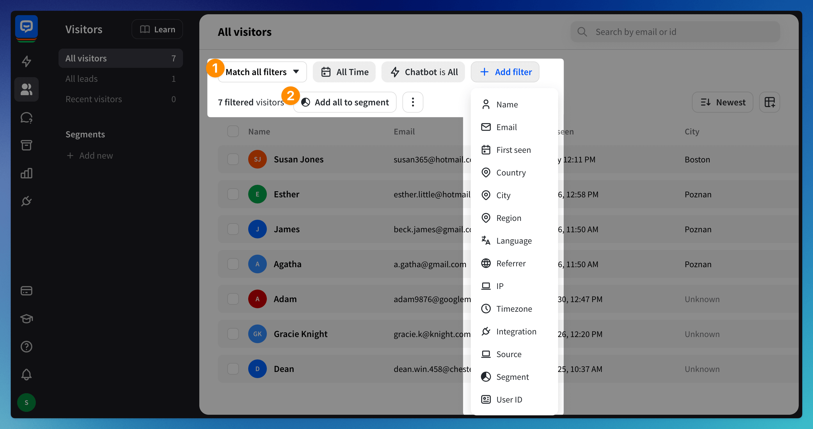 You can filter the visitors (1) based on time, bot name, and the collected information saved as default attributes during the chat. In this view, you can also add visitors to segments (2).