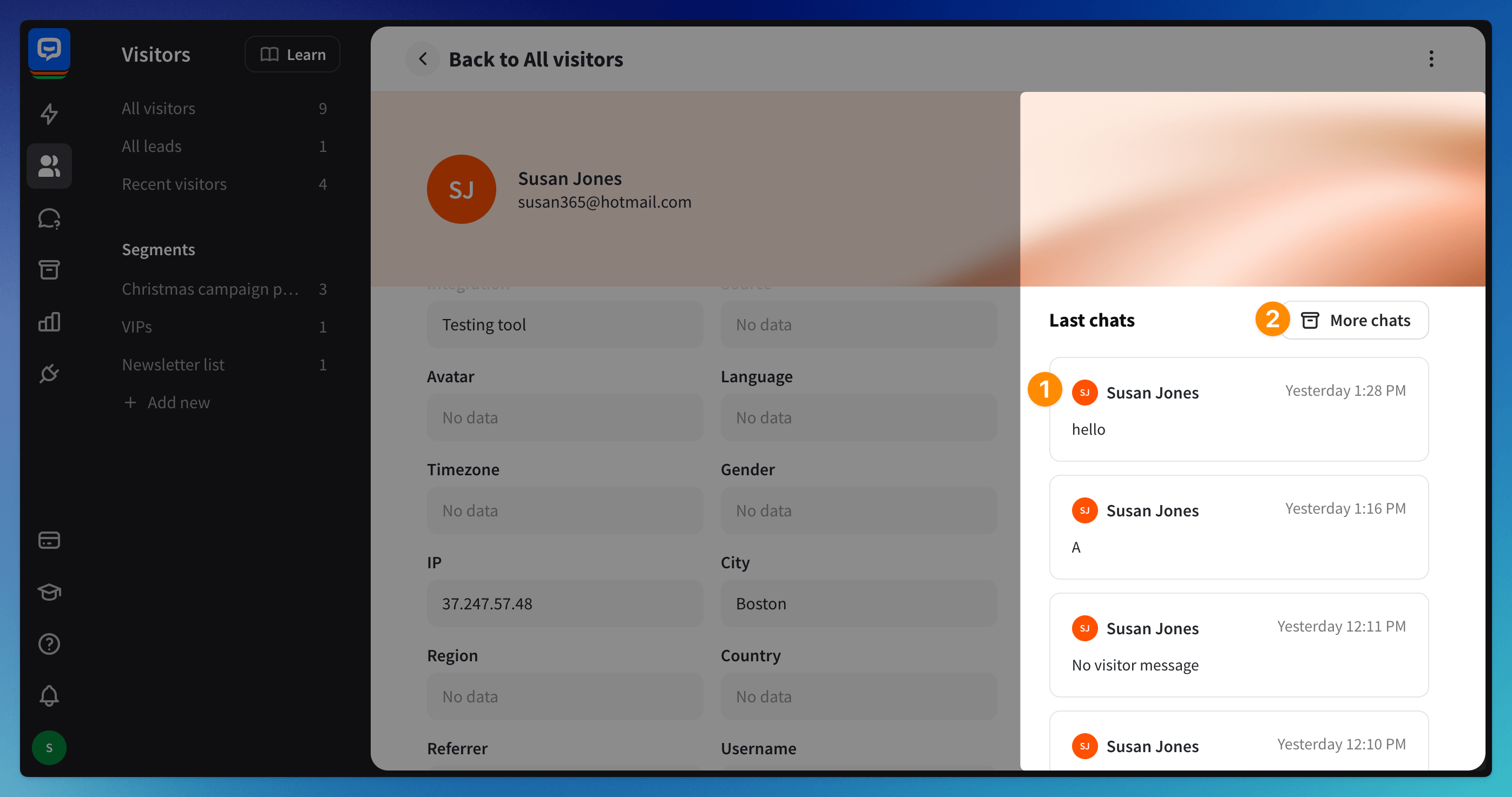 To access this view, select a visitor from the list. The visitor’s name and email address (1) will be displayed at the top of the screen.