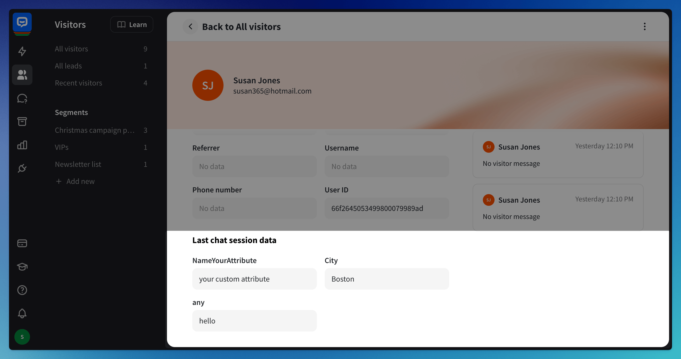 Below the Visitor data, you can see data collected during the last session. This section lets you know what has changed or happened recently if your visitor had multiple chats. If you have custom attributes, you can see the values here.